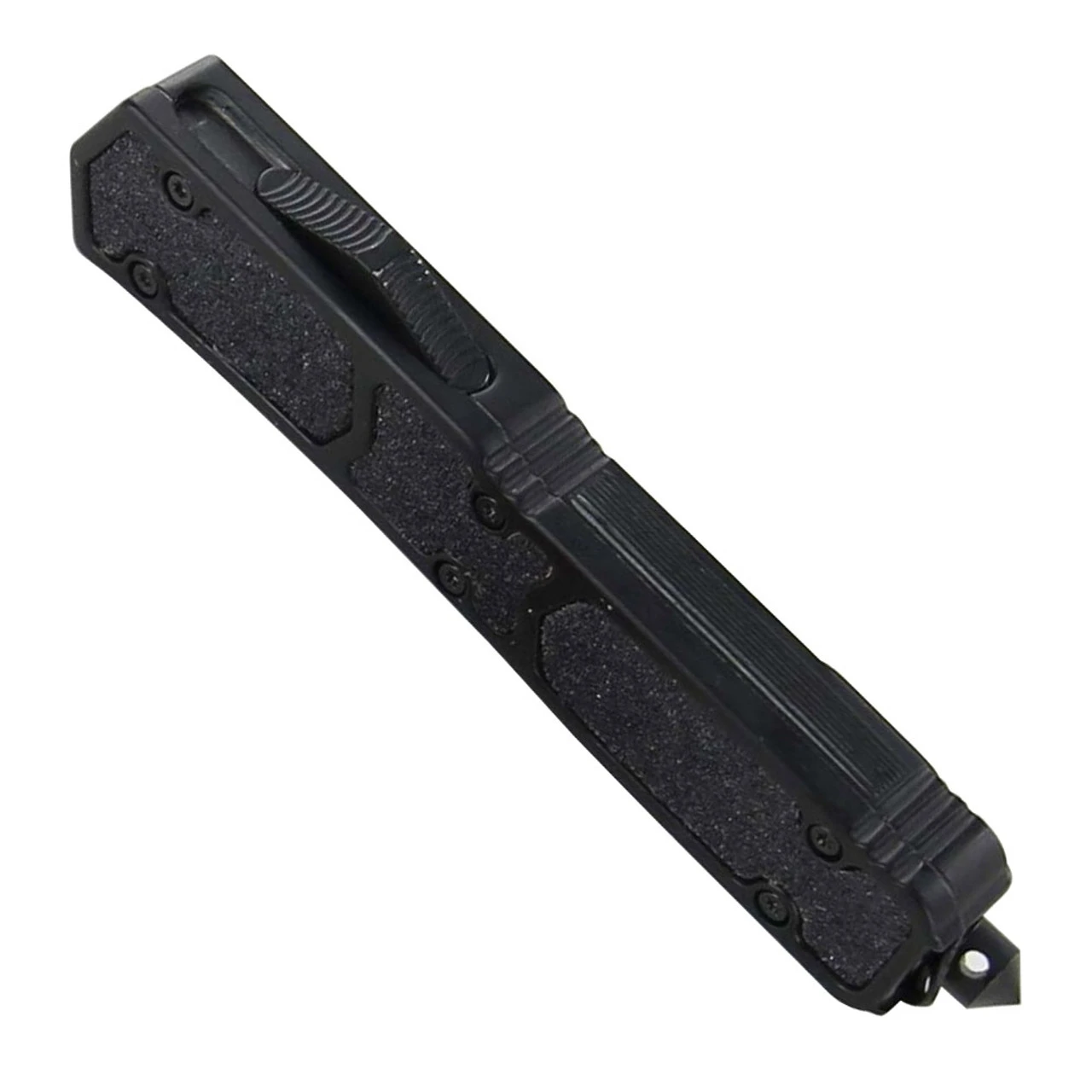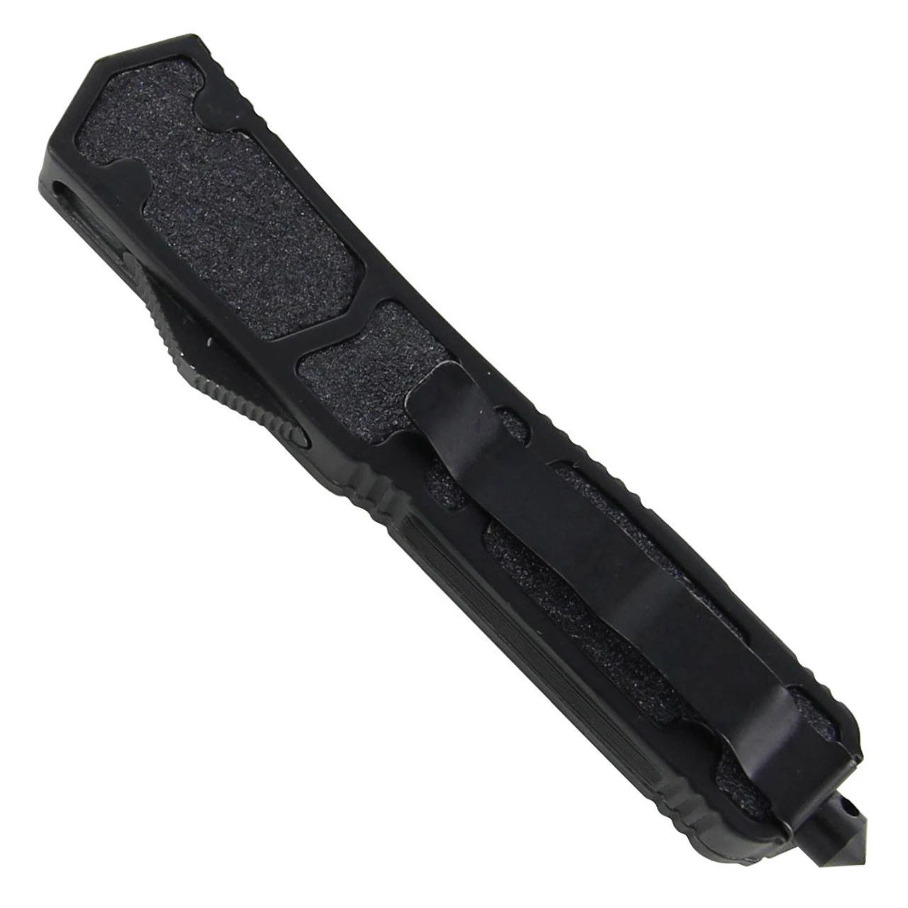 This beautiful but deadly blade is a dangerous as the all lady military group the Hunter Troop. Slim and sleek with a lovely titanium heat treated finish giving off a rainbow of colors. Made of stainless steel with a fuller running down the center in a spear point style who could ask for more? To sweeten this deal this OTF comes with a dual action function. Just push on the black trigger on the spine of the handle and watch this blade fly. Then slide it backwards to retract the blade back into the handle. The handle features a black steel finish with six hex screws and finger grips on the spine. The handle also comes with a black sand paper grip inlay seamlessly through its groove. It also sports a black pocket clip for easy access when using. The end of the handle also sports a glass breaker for emergency get-a-ways or self-defense when the need arises. This Taiwan made Dual Action OTF Knife comes equipped with a durable black nylon pouch with Velcro adjustable belt loop and side release adjustable buckle, making it easy for access, especially when in dire situations. Overall Length: 8.5 inch, Blade Length: 3.5 inch
