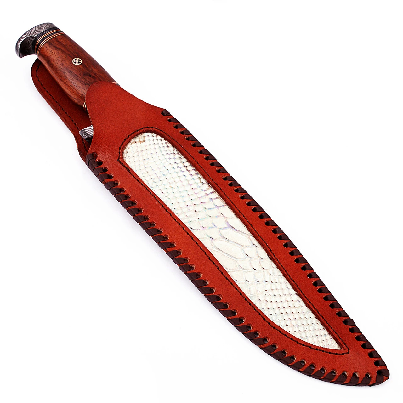 The Bayou is no place for someone who isn’t willing to wrestle with a giant alligator or two. For such a dangerous trek, you’ll need an excellent quality knife at your service. The blade of this beauty right here if forged from Damascus steel, which is well known for not only for its intriguing design, but also for its amazing ability to hold a sharp edge while still staying hard and flexible. It has between 280-350 layers, an HRC of 58-60, is made from incredible 1095/15N20 steel and has been formed into a Turkish clip point style. Not only is the blade made from Damascus steel, but so is the guard and pommel. The handle is made of durable wood and has been stained a lovely rustic color, with stained wood and brass inserts to really compliment the Damascus. Included is a high-quality leather sheath with a snake skin design. Overall Length: 16 inches, Blade Length: 10.75 inches