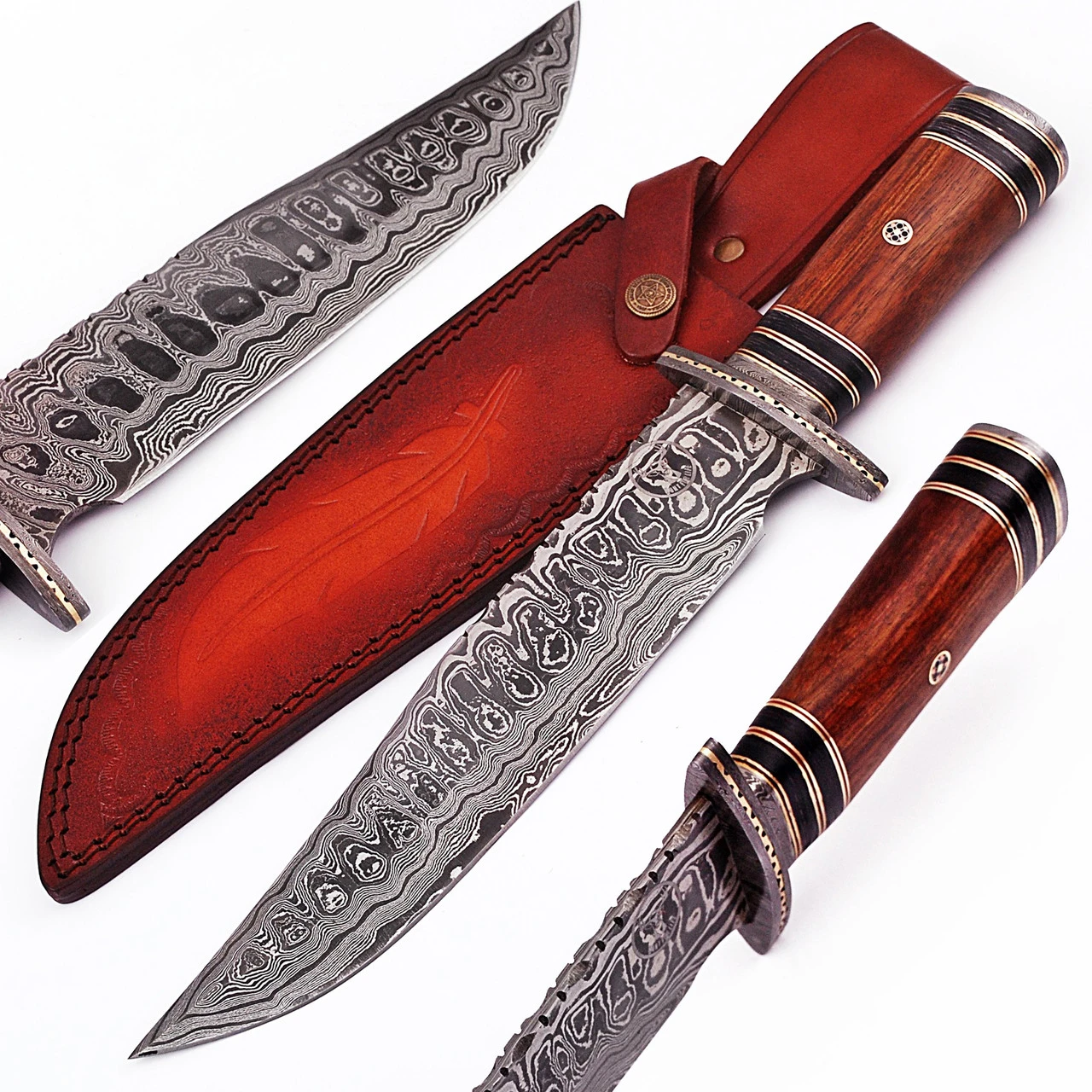 Only the roughest and toughest could survive in the wild west. Prove that you’re a worthy cowboy when you add our Hunt for Life Ruffian Outlaw Damascus Steel Hunting Knife to your arsenal. The blade is forged from excellent quality Damascus steel, with a gently sloping drop point blade. It has been folded approximately 280-350 times, with an HRC of 54-56. This blade has been fire forged with high grades of 1095/15N20 steel folded over and over again to produce the exquisite wave pattern that only true Damascus can give. The wooden handle with stained red and black wood brass inserts and small circular emblem is nothing flashy, but it compliments the Damascus perfectly. The pommel and guard are both made from Damascus as well, and the brass inlay on the guard adds the perfect finishing touch. Included is an excellent quality tooled leather sheath with a feather etched into the front. Overall Length: 14 inches, Blade Length: 9 inches
